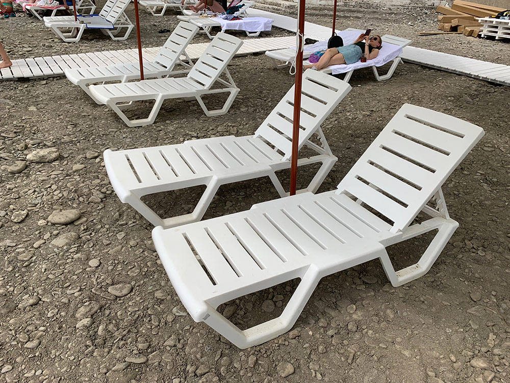 Универсальный шезлонг с тщательно продуманным дизайном, который подходит для размещения как любом виде покрытия пляжей. Устойчивы и не ломки, не проваливаются и не деформируются от неровной поверхности. На пляжах с покрытием пляжа галькой, шезлонги показали себя устойчивыми и не изменяющими своего первозданного вида. На песчаных пляжах они не проваливаются в песок и не застревают в нем.